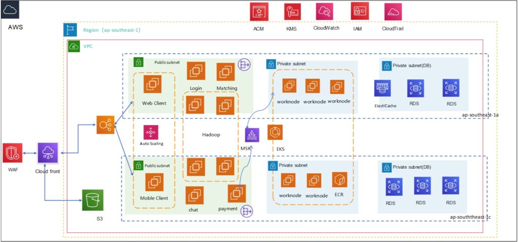 During the migration to AWS Cloud, a range of AWS services was employed to ensure data security, availability, and ease r-related data to meet storage and management needs. CloudWatch was leveraged to monitor performance metrics of resources such as EC2 and S3, and to analyze application logs for real-time data monitoring and analysis. EKS was used for managing Kubernetes clusters and deploying applications, enhancing high availability through a multi-availability zone architecture and transforming applications into microservices. Data backup and account security were ensured through services such as backup, security groups, MFA, and KMS.