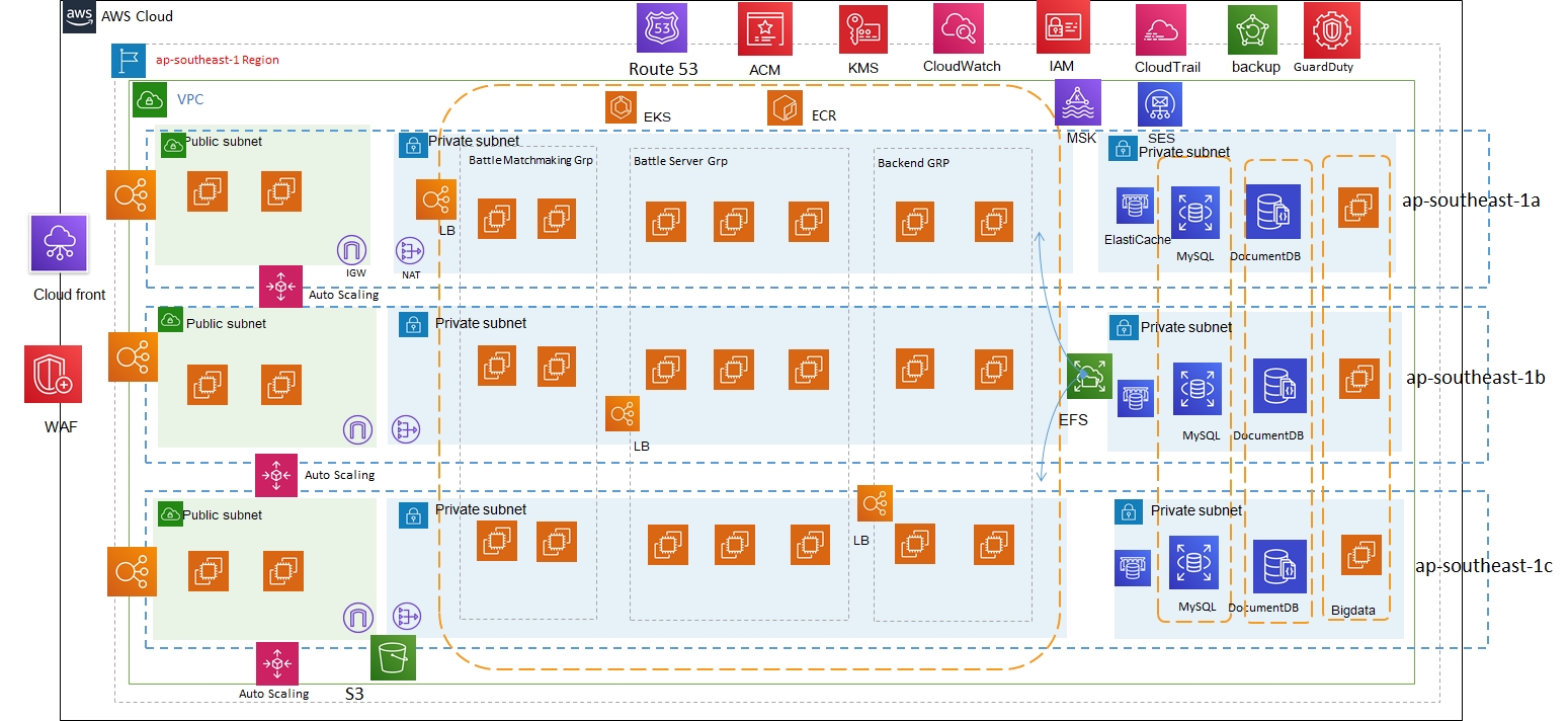 During the migration from on-premises to AWS, various AWS services were utilized to enhance data management, security, and system availability. S3 was used to store large volumes of game and log data, while RDS for MySQL, ElastiCache for Redis, and DocumentDB handled data storage and management. CloudWatch provided resource monitoring and log analysis, and AWS Backup ensured the backup and recovery of RDS and EBS, thereby guaranteeing data security. MFA and security groups were implemented to protect accounts, and KMS encryption further safeguarded EBS, RDS, and S3 data. The company leveraged a microservices architecture with EKS to improve business flexibility and scalability, while MSK was used for efficient data stream processing, ensuring stable system performance and sustained business growth.